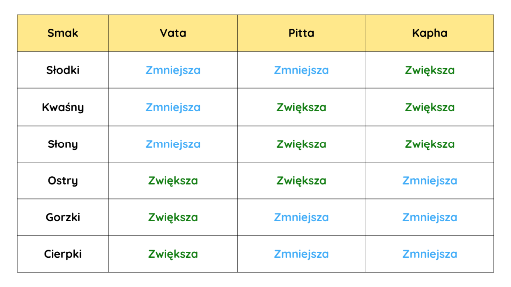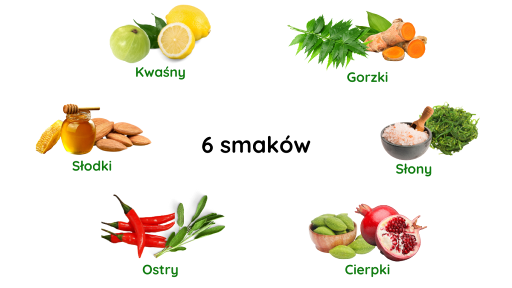 Według ajurwedy zmysł smaku jest naturalnym przewodnikiem po odżywianiu. Każdy smak ma unikalne właściwości, które wpływają na nasze zdrowie fizyczne i emocjonalne. Zgodnie z ajurwedą smaki oddziałują na dosze, pomagając w utrzymaniu ich w równowadze. Ajurweda wyróżnia sześć smaków: słodki, kwaśny, słony, ostry, gorzki oraz cierpki.